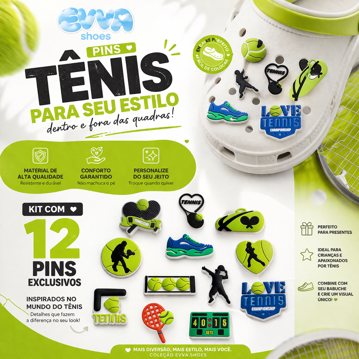 Deixe seu calçado ainda mais estiloso e cheio de personalidade com esse kit exclusivo de pins temáticos de tênis. Perfeito para quem ama esporte, estilo e customização!
